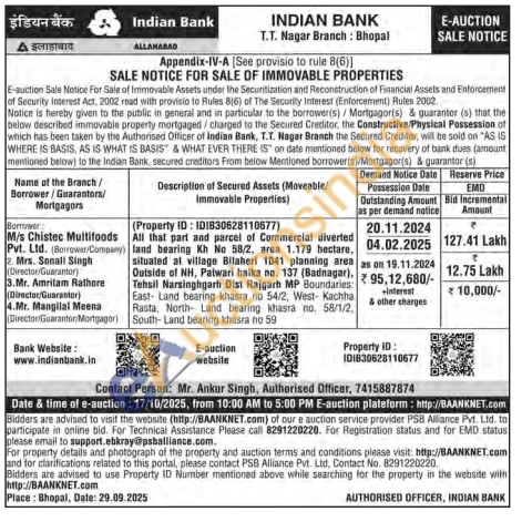All that part and parcel of Commercial diverted land bearing Kh No 58/2, area 1.179 hectare, situated at village Bilakeri 1041 planning area Outside of NH, Patwari halka no. 137 (Badnagar), Tehsil Narsinghgarh Dist Rajgarh MP Boundaries: East Land bearing khasra no 54/2, West- Kachha Rasta, North Land bearing khasra no. 58/1/2. South-Land bearing khasra no 59