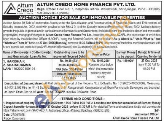 Description of Secured Asset: All that piece and parcel of the Property No.7 E-Swathu No. 151200204100500082, Measuring 9.144x12.192 Mirs le 111.48 Sq.Mtrs, Situated at Sri Ranganahalli, Kanagondanahalli Gram Panchayath, Davangere and bounded as under-East: Site No. 08 West: Site No. 06 North: Site No. 02 South: Road