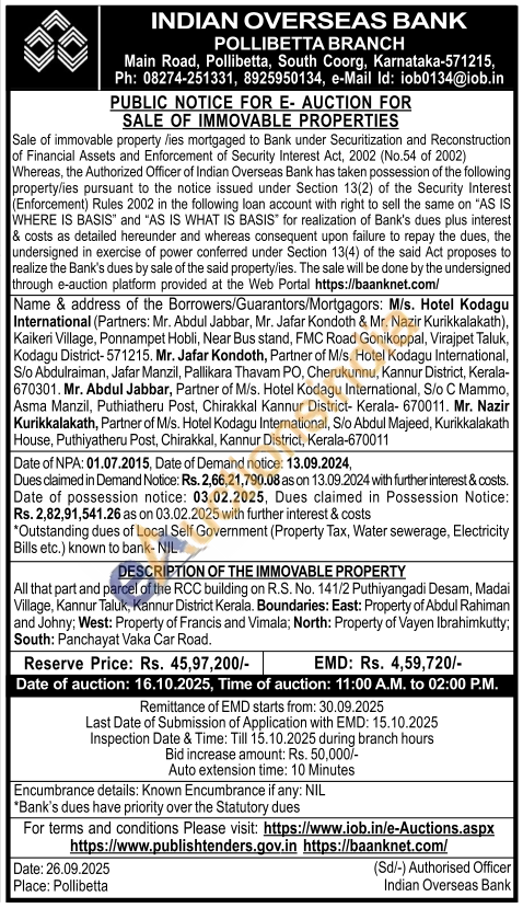 All that part and parcel of the RCC building on R.S. No. 141/2 Puthiyangadi Desam, Madai Village, Kannur Taluk, Kannur District Kerala. Boundaries: East: Property of Abdul Rahiman and Johny; West: Property of Francis and Vimala; North: Property of Vayen Ibrahimkutty; South: Panchayat Vaka Car Road.
