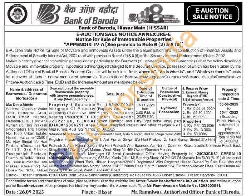 Property-1 -Mortgage Of Property Consisting Of Shop No 465 Bearing PROPERITY ID 32C22106, CERSAI ID400012866251 Area Measuring 400 Sq YardsSituated At Scheme No. 3, Improvement Trust, Auto Market, Hissar. Registered WithRegistrar Hissar Belonging To 1. Anil Kumar Singal S/o Hari Prakash 2. Sunil Kumar Singal S/o Hari