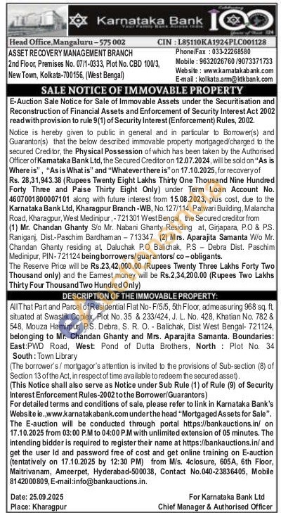 All That Part and Parcel of Residential Flat No-F/5/5, 5th Floor, admeasuring 968 sq. ft, situated at Swastik Coplex, Plot No. 35 & 233/424, J. L. No. 428, Khatian No. 782 & 548, Mouza Hamirpur, P.S. Debra, S. R. O. Balichak, Dist West Bengal-721124, belonging to Mr. Chandan Ghanty and Mrs. Aparajita Samanta. Boundaries: East:PWD Road, West: Pond of Dutta Brothers, North Plot No. 34 South: Town Library
