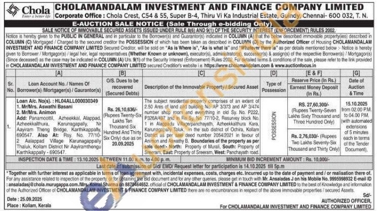 The subject residential property comprises of an extent of 2.50 Ares of land and building No. AP 3/373 and AP 3/474 number shop room and everything in oil Sy. No. P222, P326A/497 and in Re Sy. No. 77/10-2, Resuniey block No. 1 in Alappadu Village/panchayath, Azheekkalthura Kara Karunagapaly Taluk, in the sub district of Ochira. Kollam District as per sale deed number 2054/2021 in favour of Animon and Aswathy B. Boundaries of the property as per sale deed: North: Property of Murali, South: Property of Sreeram, East: Property of Sreeram, West: Panchayath road.