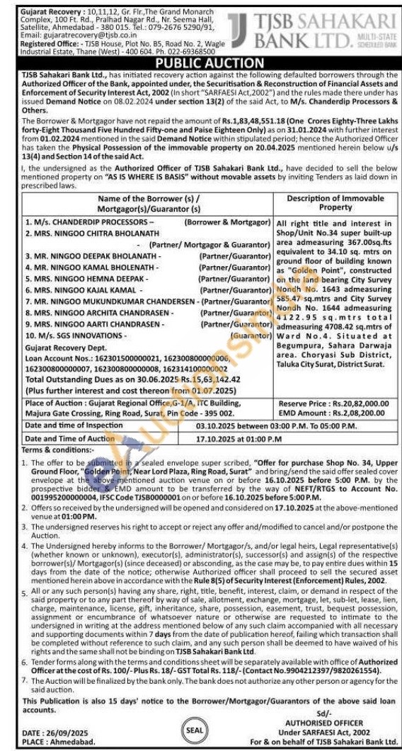 All right title and interest in Shop/Unit No.34 super built-up area admeasuring 367.00sq.fts equivalent to 34.10 sq. mtrs on ground floor of building known as "Golden Point", constructed on the land bearing City Survey Nondh No. 1643 admeasuring 585.47 sq.mtrs and City Survey Nondh No. 1644 admeasuring 4122.95 sq.mtrs total admeasuring 4708.42 sq.mtrs of Ward No.4. Situated at Begumpura, Sahara Darwaja area. Choryasi Sub District, Taluka City Surat, District Surat.