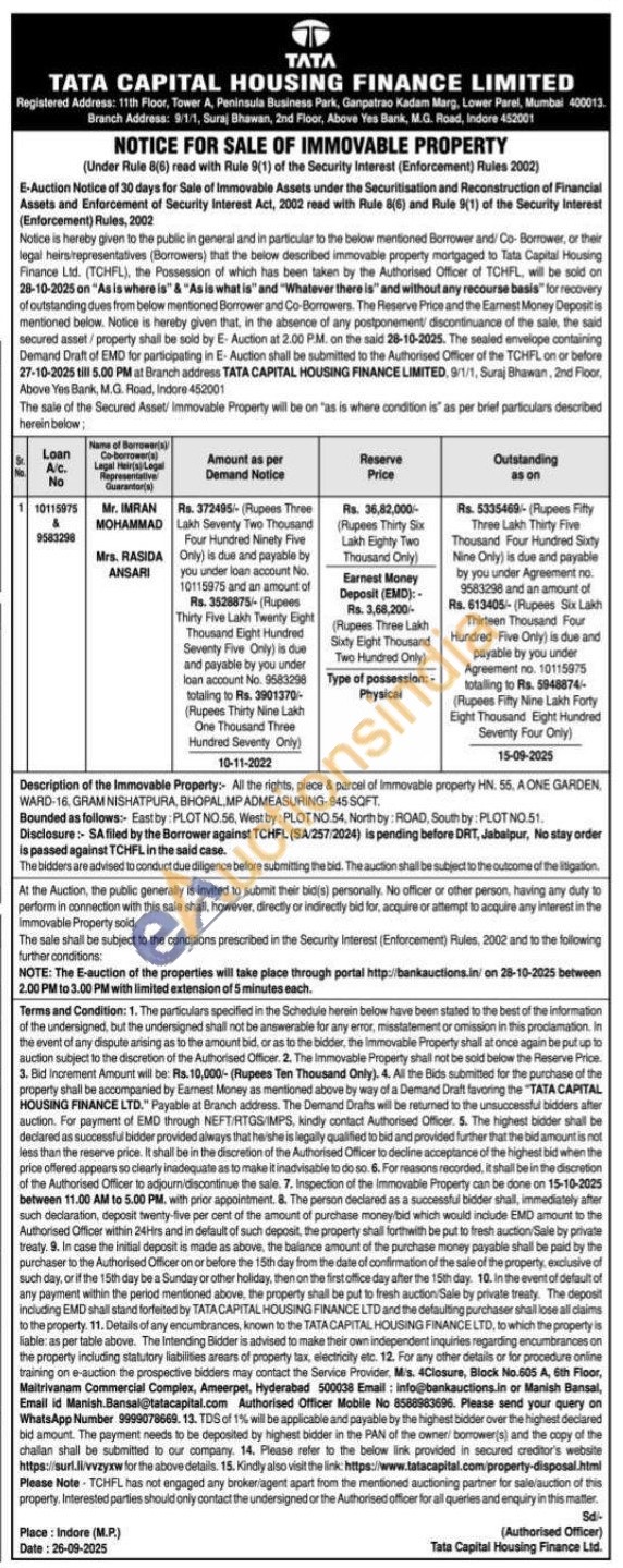 Description of the Immovable Property: All the rights, piece & parcel of Immovable property HN. 55. A ONE GARDEN, WARD-16, GRAM NISHATPURA, BHOPAL, MP ADMEASURING-945 SQFT. Bounded as follows:- Eastby: PLOT NO.56, West by: PLOT NO.54, North by: ROAD, South by: PLOT NO.51. Disclosure: SA filed by the Borrower against TCHFL (SA/257/2024) is pending before DRT, Jabalpur, No stay order is passed against TCHFL in the said case. The bidders are advised to conduct due diligence before submitting the bid. The auction shall be subject to the outcome