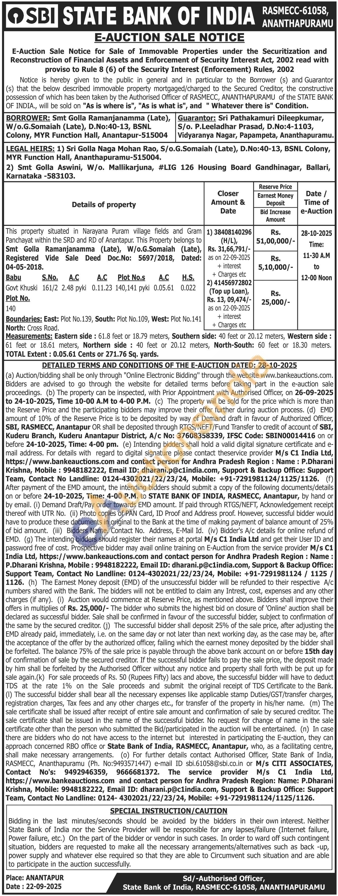 This property situated in Narayana Puram village fields and Gram Panchayat within the SRD and RD of Anantapur. This Property belongs to Smt Golla Ramanjanamma (Late), W/o.G.Somaiah (Late), Registered Vide Sale Deed Doc.No: 5697/2018, DatedBoundaries: East: Plot No.139, South: Plot No. 109, West: Plot No. 141 North: Cross Road. Measurements: Eastern side: 61.8 feet or 18.79 meters, Southern side:Govt Khuski 161/2 2.48 pyki 0.11.23 140,141 pyki 0.05.61 0.022 Plot No. 140 40 feet or 20.12 meters, Western side : 61 feet or 18.61 meters, Northern side: 40 feet or 20.12 meters, North-South: 60 feet or 18.30 meters. TOTAL Extent: 0.05.61 Cents or 271.76 Sq. yards.