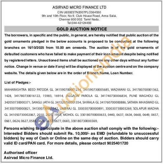 Asirvad Micro Finance Ltd Gold Auctions Auction in Chennai