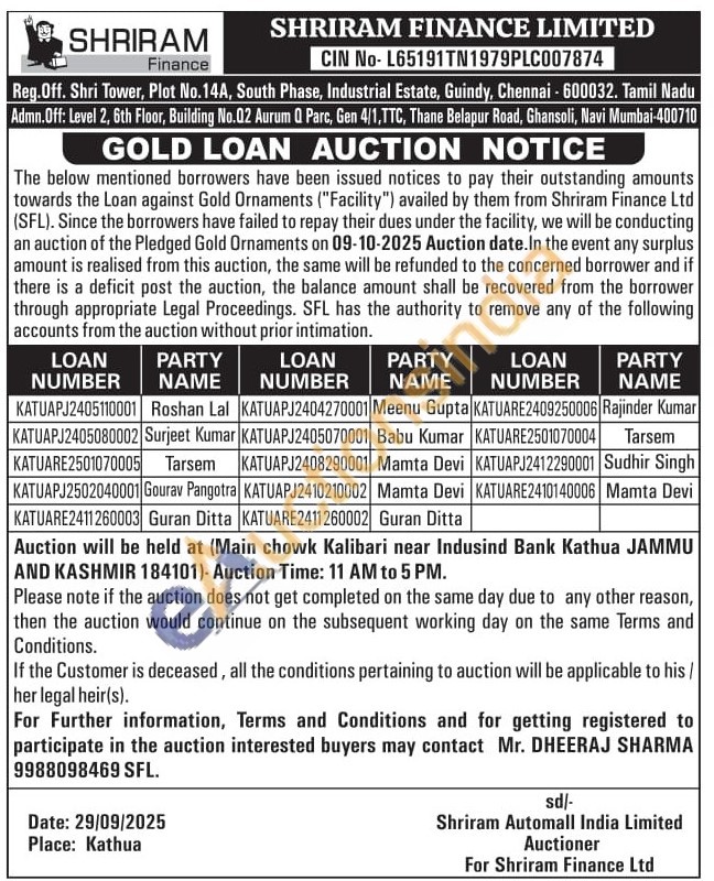 Shriram Finance Ltd Gold Auctions Auction in Kathua