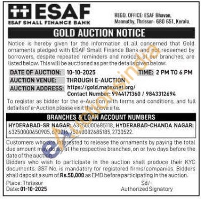 ESAF SMALL FINANCE BANK Gold Auctions Auction in Thrissur