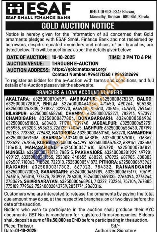 ESAF SMALL FINANCE BANK Gold Auctions Auction in Thrissur