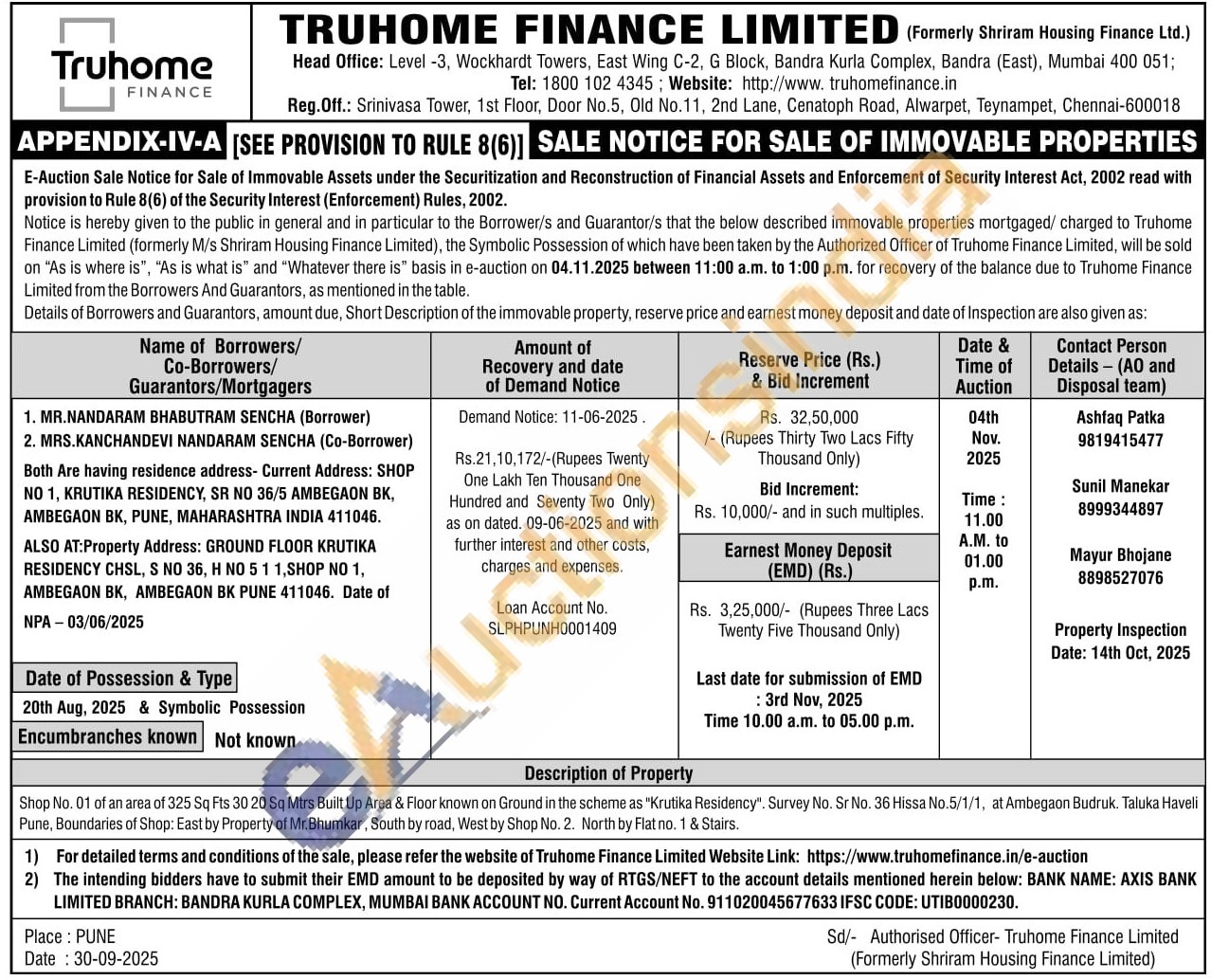 Shop No. 01 of an area of 325 Sq Fts 30 20 Sq Mtrs Built Up Area & Floor known on Ground in the scheme as "Krutika Residency". Survey No. Sr No. 36 Hissa No.5/1/1, at Ambegaon Budruk. Taluka Haveli Pune, Boundaries of Shop: East by Property of Mr. Bhumkar, South by road, West by Shop No. 2. North by Flat no. 1 & Stairs