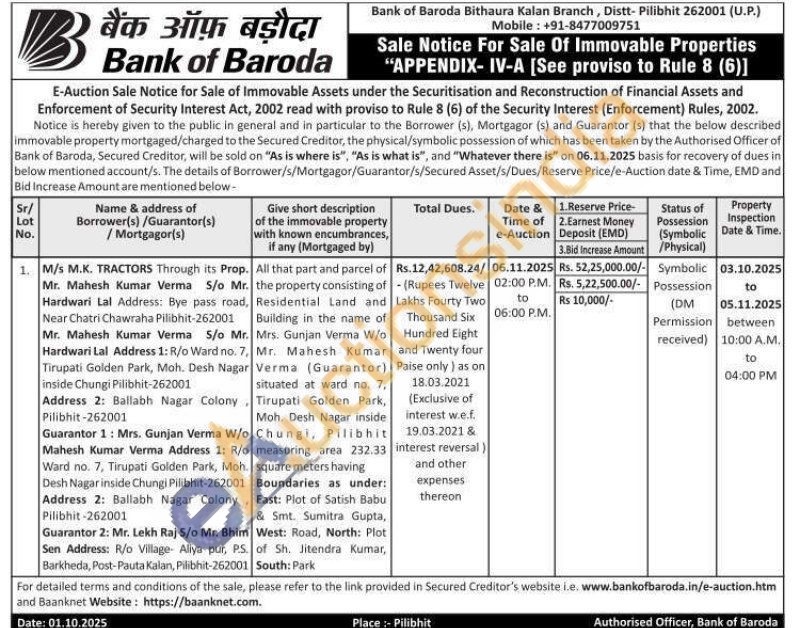 All that part and parcel of the property consisting of Residential Land and Building in the name of Mrs. Gunjan Verma W/o Mr. Mahesh Kumar Verma (Guarantor) situated at ward no. 7, Tirupati Golden Park, Moh. Desh Nagar inside Chungi, Pilibhit measuring area 232.33 square meters