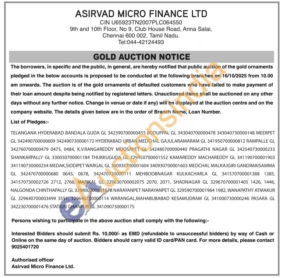 Asirvad Micro Finance Ltd Gold Auctions Auction in Hyderabad