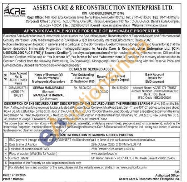 DESCRIPTION OF THE SECURED ASSET: DESCRIPTION OF THE SECURED ASSET: THE PREMISES BEARING Flat No 603 on the 6th floor, A Wing, in the building known as Jupiter, situated at Poonam Sagar Complex, Mira Road East, Dist-Thane 401107, admeasuring area about 63.47 Sq. Mtrs. (Built Up), on the Sixth Floor, in the JUPITER MERCURY Co-Operative Housing Society Limited, a registered society and bearing Registration no. TNA/(TNA)/HSG/(TC) 16783/2005-2006, constructed on Plot of land bearing Old Survey No. 204 & 206, New Survey No. 36 & 38, situated at Vilage PENKARPADA in the Registration District, Sub District of Thane