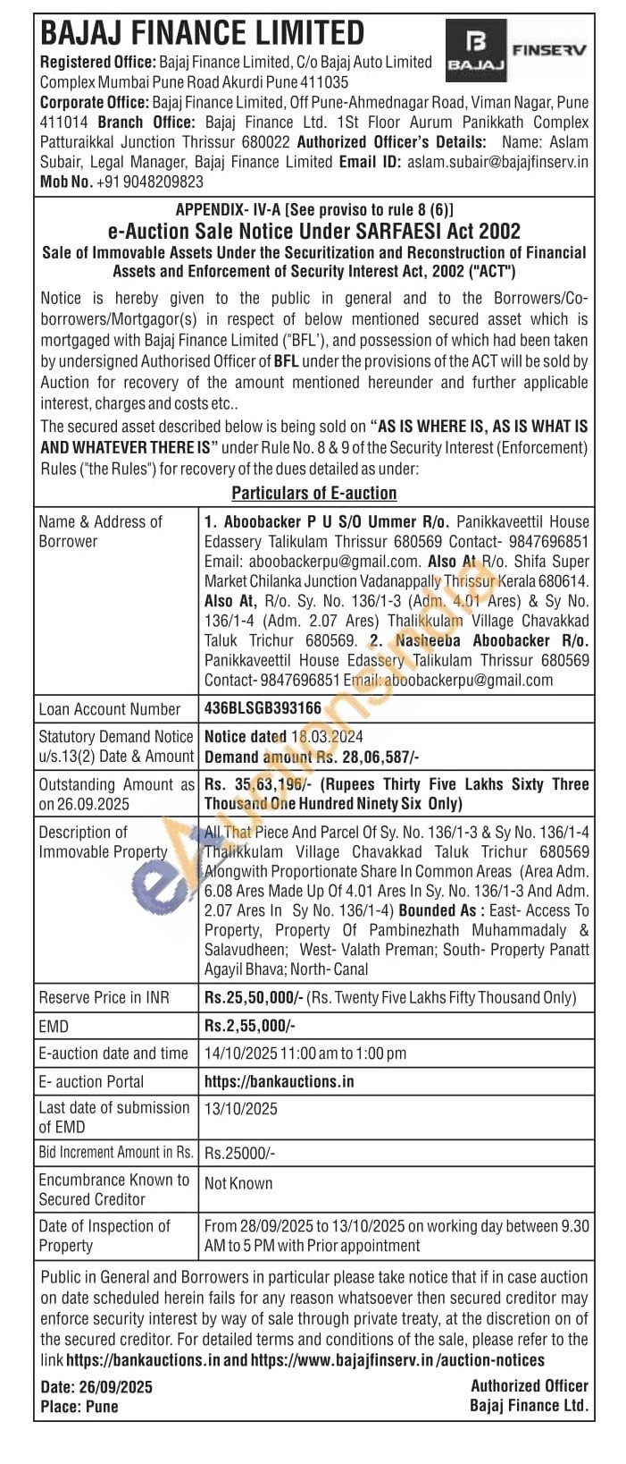 All That Piece And Parcel Of Sy. No. 136/1-3 & Sy No. 136/1-4 Thalikkulam Village Chavakkad Taluk Trichur 680569 Alongwith Proportionate Share In Common Areas (Area Adm. 6.08 Ares Made Up Of 4.01 Ares In Sy. No. 136/1-3 And Adm. 2.07 Ares In Sy No. 136/1-4) Bounded As: East- Access To Property, Property Of Pambinezhath Muhammadaly & Salavudheen; West-Valath Preman, South- Property Panatt Agayil Bhava: North-Canal