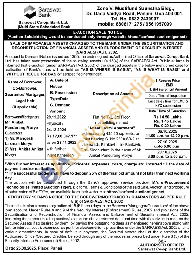 Flat No T-2, 3rd Floor, in a building named "Anant Laxmi Apartment" admeasuring 435.35 sq. feets, on plot bearing S. No 230A/6B/2 at Jalkewadi, Kankavli, Tal- Kankavli, Dist- Sindhudurg in the name of Mr. Aniket Pandurang Morye