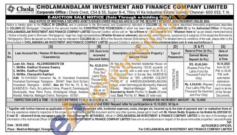 All that the semi finished residential House on Plot No. 75, admeasuring 133.33 sq.yards or 111.46 sq.mtrs, with a slab area 1150 sft, R. C. C, in Ground Floor, in Survey Nos. 6A/B/D/E/G parts, situated at 'SRI LAKSHMI COLONY PHASE-III of AHMEDGUDA (BAND LAGUDA) village, under Dammaiguda Muncipality, Keesara Mandal, Medchal-Malkajgin District, and Bounded by: North: Plot No. 74, South: 25 wide road, East Plot No. 67, West: 25 wide road