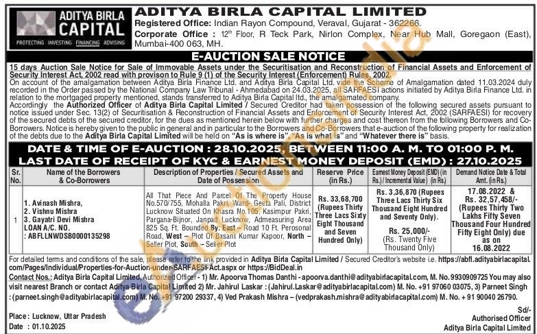 All That Piece And Parcel Of The Property House No.570/755, Mohalla Pakri, Ward- Geeta Pali, District Lucknow Situated On Khasra No.105, Kasimpur Pakri, Pargana-Bijnor, Janpad Lucknow, Admeasuring Area 825 Sq. Ft. Bounded By: East-Road 10 Ft. Perosonal Road, West Plot Of Basant Kumar Kapoor, North Seller Plot, South - Seller Plot