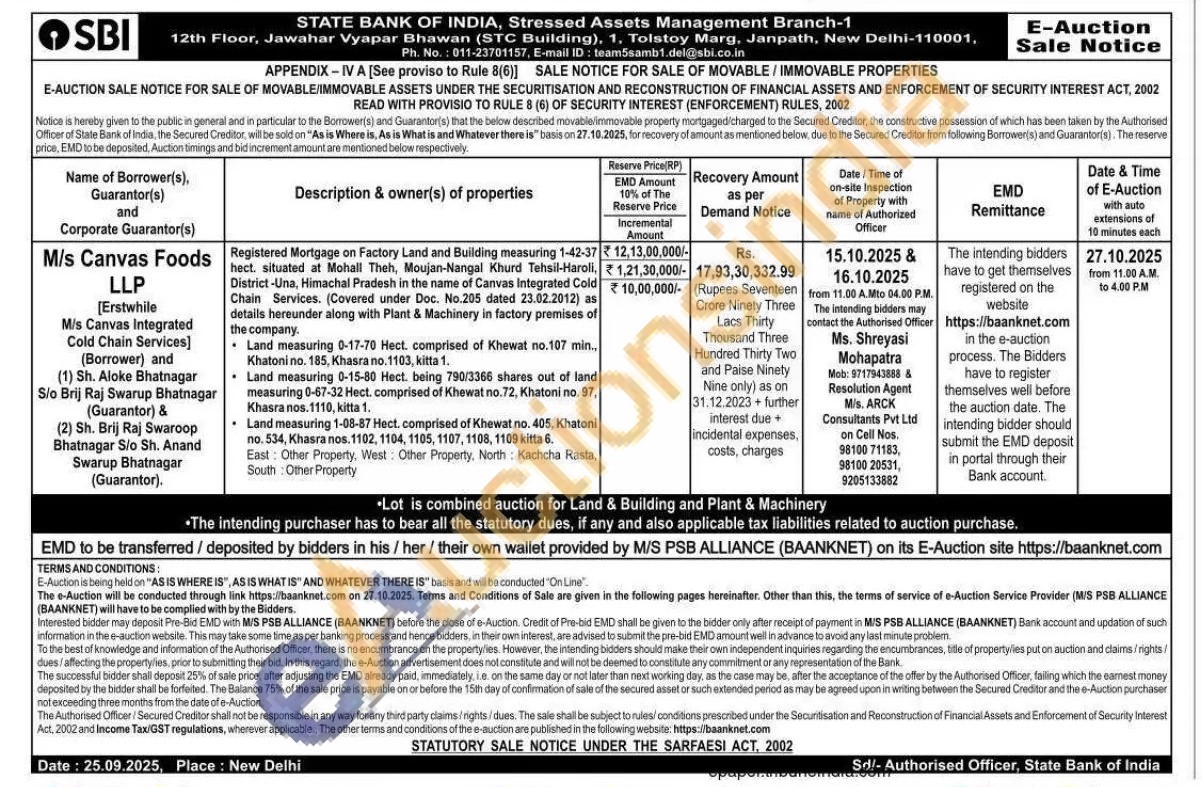 Registered Mortgage on Factory Land and Building measuring 1-42-37 hect. situated at Mohall Theh, Moujan-Nangal Khurd Tehsil-Haroli, District-Una, Himachal Pradesh in the name of Canvas Integrated Cold Chain Services. (Covered under Doc. No.205 dated 23.02.2012) as details hereunder along with Plant & Machinery in factory premises of the company. Land measuring 0-17-70 Hect. comprised of Khewat no.107 min., Khatoni no. 185, Khasra no. 1103, kitta 1. Land measuring 0-15-80 Hect. being 790/3366 shares out of land measuring 0-67-32 Hect. comprised of Khewat no.72, Khatoni no. 97, Khasra nos. 1110, kitta 1. Land measuring 1-08-87 Hect. comprised of Khewat no. 405, Khatoni no. 534, Khasra nos. 1102, 1104, 1105, 1107, 1108, 1109 kitta 6. East: Other Property, West: Other Property, North Kachcha Rasta, South Other Property
