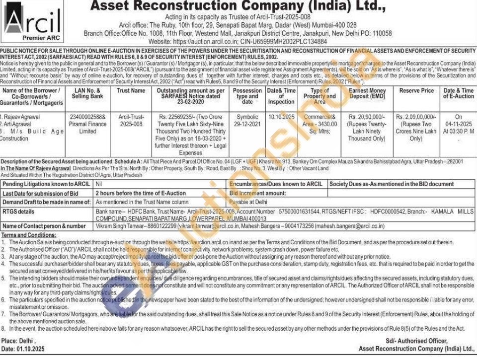 All That Piece And Parcel Of Office No. 04 (LGF+UGF) Khasra No 913, Bankey Om Complex Mauza Sikandra Bahisstabad Agra, Uttar Pradesh-282001 In The Name Of Rajeev Agrawal Directions As Per The Site: North By: Other Property, South By Road, East By: Shop No. 3, West By: Other Vacant Land And Situated Within The Registration District Of Agra, Uttar Pradesh