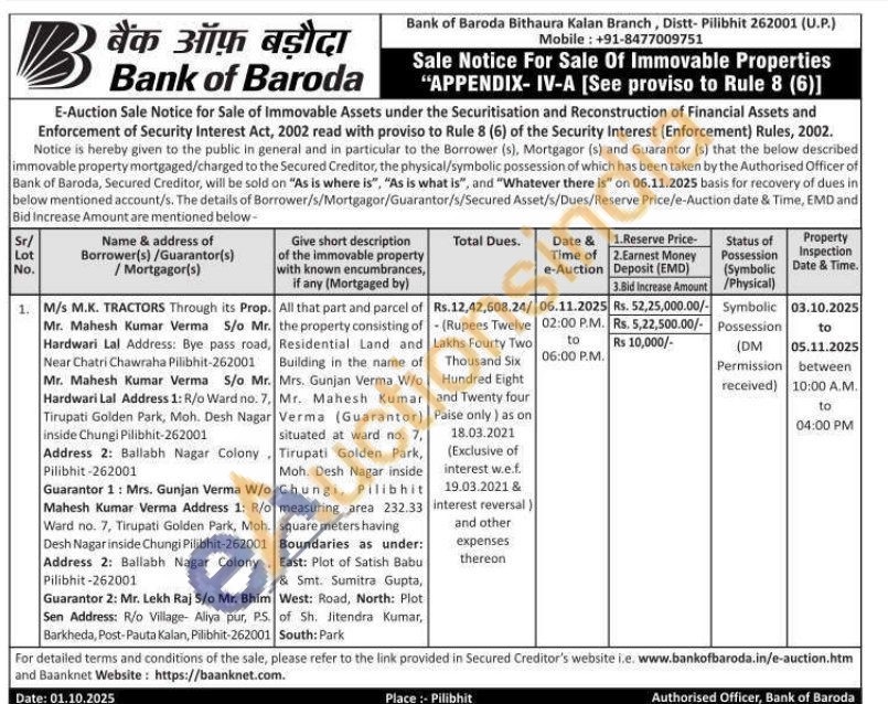 All that part and parcel of the property consisting of Residential Land and Building in the name of Mrs. Gunjan Verma W/o Mr. Mahesh Kumar Verma (Guarantor) situated at ward no. 7, Tirupati Golden Park, Moh. Desh Nagar inside Chungi, Pilibhit measuring area 232.33 square meters having