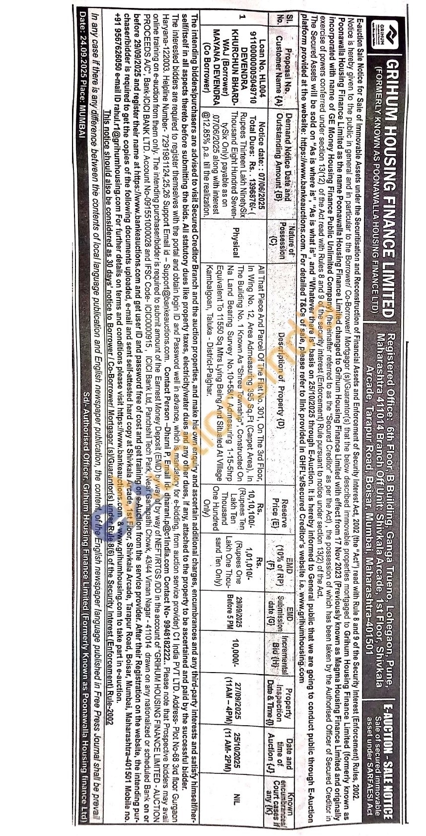 All That Piece And Parcel Of The Flat No. 301, On The 3rd Floor, In Wing No. 12, Area Admeasuring 395 Sq.Ft (Carpet Area), In The Building No. 1 Known As "Shree Township", Constructed On Na Land Bearing Survey No.10+58/1 Admesuring 1-15-5hrp Equivalent To 11550 Sq Mtrs Lying Being And Situaled At Village Kambalgoan, Taluka - District-Palghar