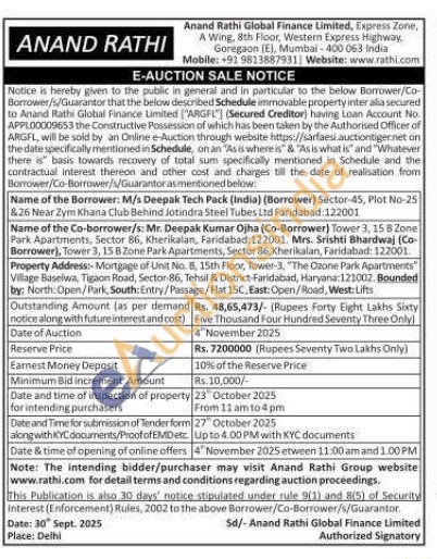 Mortgage of Unit No. 8, 15th Floor, Tower-3, "The Ozone Park Apartments" Village Baselwa, Tigaon Road, Sector-86, Tehsil & District-Faridabad, Haryana:121002, Bounded by: North: Open/Park, South: Entry/Passage/Flat 15C, East: Open/Road, West: Lifts