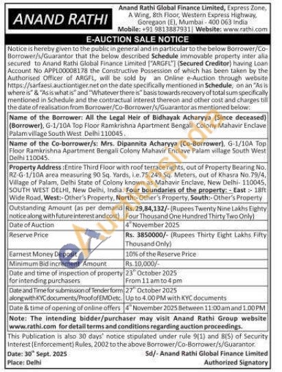 Entire Third Floor with roof terrace rights, out of Property Bearing No. RZ-G-1/10A area measuring 90 Sq. Yards, ie.75.249 Sq. Meters, out of Khasra No. 79/4, Village of Palam, Delhi State of Colony known as Mahavir Enclave, New Delhi-110045, SOUTH WEST DELHI, New Delhi, India. Four boundaries of the property: East:-18ft Wide Road, West: Other's Property, North: Other's Property, South: Other's Property