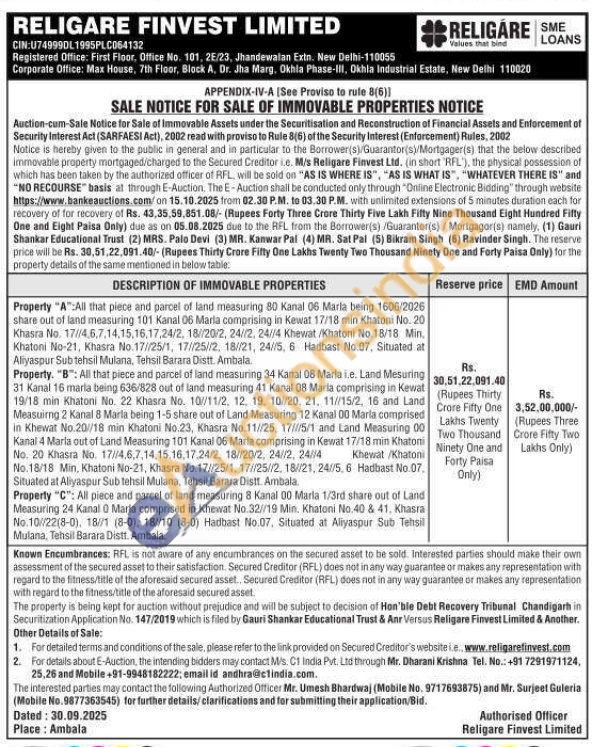 Property "A" All that piece and parcel of land measuring 80 Kanal 06 Marla being 1606/2026 share out of land measuring 101 Kanal 06 Maria comprising in Kewat 17/18 min Khatoni No. 20 Khasra No. 17//4,6,7,14,15,16,17,24/2, 18//20/2, 24//2, 24//4 Khewat/Khatoni No.18/18 Min. Khatoni No-21, Khasra No.17//25/1, 17//25//2, 18//21, 24//5, 6 Hadbast No.07, Situated at Aliyaspur Sub tehsil Mulana, Tehsil Barara Distt. Ambala Property. "B": All that piece and parcel of land measuring 34 Kanal 08 Marla i.e. Land Mesuring 31 Kanal 16 marla being 636/828 out of land measuring 41 Kanal 08 Marla comprising in Kewat 19/18 min Khatoni No. 22 Khasra No. 10//11/2, 12, 19, 10/20, 21, 11//15/2, 16 and Land Measuirng 2 Kanal 8 Marla being 1-5 share out of Land Measuring 12 Kanal 00 Marla comprised in Khewat No.20//18 min Khatoni No.23, Khasra No.11//25, 17///5/1 and Land Measuring 00 Kanal 4 Marla out of Land Measuring 101 Kanal 06 Marla comprising in Kewat 17/18 min Khatoni No. 20 Khasra No. 17//4,6,7,14,15,16,17,24/2, 18//20/2, 24/2, 24/14 Khewat /Khatoni No.18/18 Min, Khatoni No-21, Khasra No. 17//25/1,17//25//2, 18//21, 24//5, 6 Hadbast No.07. Situated at Aliyaspur Sub tehsil Mulana, Tehsil Barara Distt. Ambala Property "C": All piece and parcel of land measuring 8 Kanal 00 Marla 1/3rd share out of Land Measuring 24 Kanal 0 Maria comprised in Khewat No.32//19 Min. Khatoni No.40 & 41, Khasra No. 10/22(8-0), 18//1 (8-0), 18//10 (8-0) Hadbast No.07. Situated at Aliyaspur Sub Tehsil Mulana, Tehsil Barara Distt. Ambala