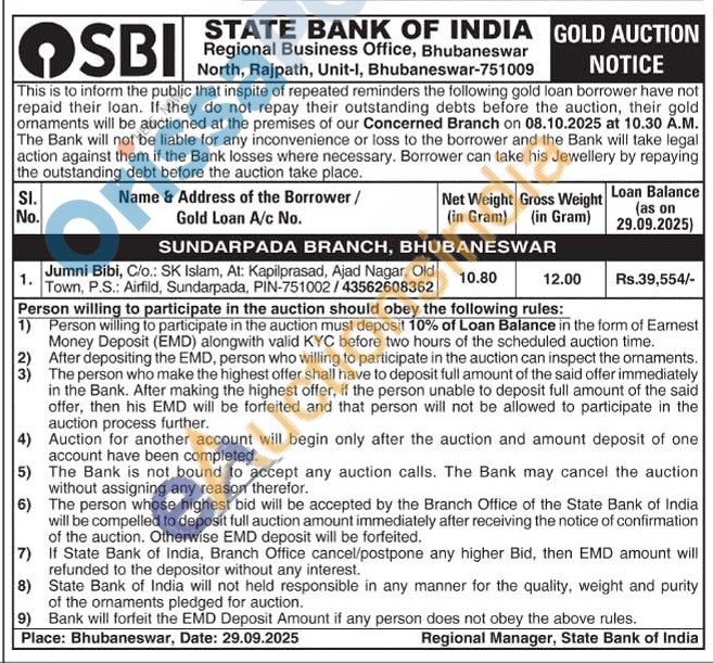 State Bank of India Gold Auctions Auction in Bhubaneswar