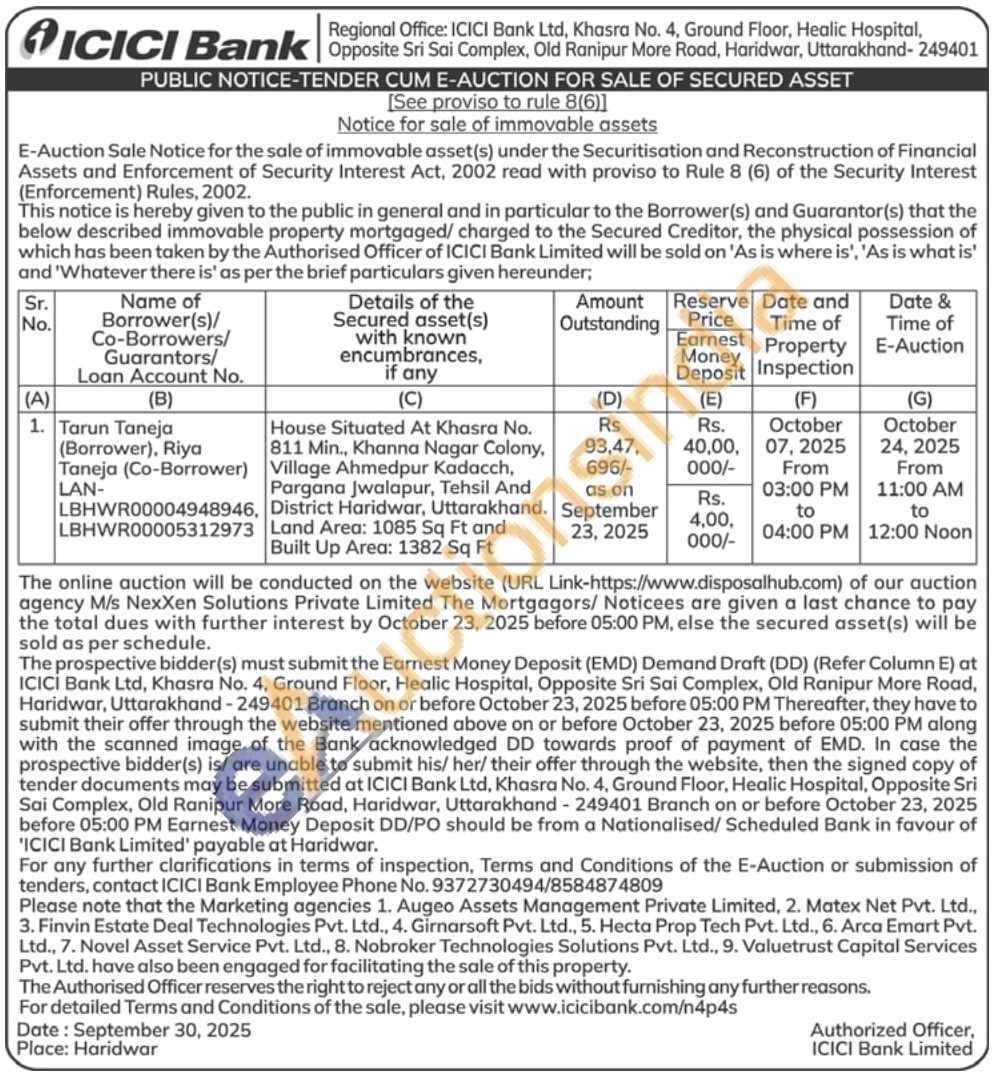 House Situated At Khasra No. 811 Min., Khanna Nagar Colony, Village Ahmedpur Kadacch, Pargana Jwalapur, Tehsil And Land Area: 1085 Sq Ft and Built Up Area: 1382 Sq Ft District Haridwar, Uttarakhand
