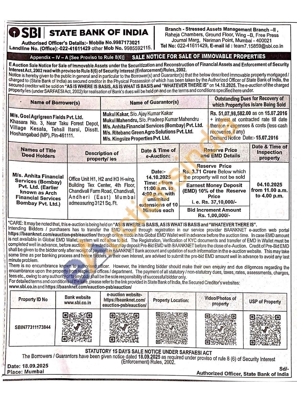 Office Unit H1, H2 and H3 H-wing, Building Tex Center, 4th Floor, Chandivali Farm Road, Chandivali, Andheri (East) Mumbai admeasuring 3121 Sq. Ft