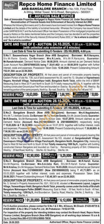 DESCRIPTION OF PROPERTY: All that piece and parcel of immovable property bearing Site No. 5. formed in Property Assessment No. 93/1, 93/2 & 95, situated at Muneswara Layout, Laggere Village, Yeswanthapur Hobli, Bengaluru North Taluk, presently comes under the limits of Bruhath Bengalure Mahanagara Palike (BBMP) Measuring: East to West: 30 feet. North to South: 40 feet, Totally measuring: 1200 Sq.ft., And Bounded on: East by: Road, West by: Site No. 2. North by Site No. 1, South by Site No. 4.