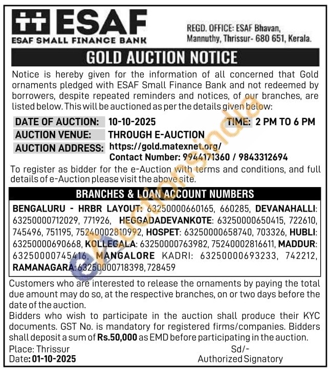 ESAF SMALL FINANCE BANK Gold Auctions Auction in Thrissur