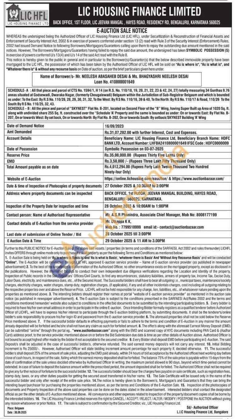 SCHEDULE-A: All that piece and parcel of CTS No. 1594/1, H 14 (on R.S. No. 110/18, 19, 20, 21, 22, 23 & 42, 24, 27) totally measuring 34 Gunthas 9.76 annas situated at Godsewadi, Dwaraka Nagar, (formerly Chougalewadi) Belgaum within the Jurisdiction of Sub-Registrar Belgaum and which is bounded as under: To the East: By R.S No. 110/26, 28, 29, 30, 31, 32, To the West: By RS No. 110/16, 39 & 40, To the North: By RS No. 110/17 & Road, 110/26 To the South: By RS No. 110/25, 32, 43. SCHEDULE-B: All the piece and parcel of "SKYNEST" Flat No. B-201, located on Second Floor of the "B" Wing, having Super Built up Area of 1020 Sq. ft. along with undivided share 255 Sq. ft. constructed over the "Schedule 'A' Property and the same is bounded as under: On or towards East: By Flat No. B-207, On or towards West: By set back, On or towards North: By Flat No. B-202, On or towards South: By setback/SKYNEST Building 'A' Wing
