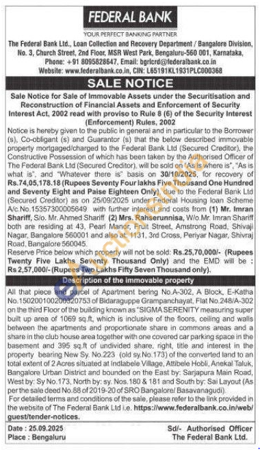 All that piece and parcel of Apartment bering No.A-302, A Block, E-Katha No.150200100200320753 of Bidaraguppe Grampanchayat, Flat No.248/A-302 on the third Floor of the building known as "SIGMA SERENITY measuring super built up area of 1069 sq.ft, which is inclusive of the floors, ceiling and walls between the apartments and proportionate share in commons areas and a share in the club house area together with one covered car parking space in the basement and 395 sq.ft of undivided share, right, title and interest in the property bearing New Sy. No. 223 (old sy. No. 173) of the converted land to an total extent of 2 Acres situated at Indiabele Village, Attibele Hobli, Anekal Taluk, Bangalore Urban District and bounded on the East by: Sarjapura Main Road, West by: Sy No. 173, North by: sy. Nos. 180 & 181 and South by: Sai Layout (As per the sale deed No.88 of 2019-20 of SRO Bangalore/ Basavanagudi)