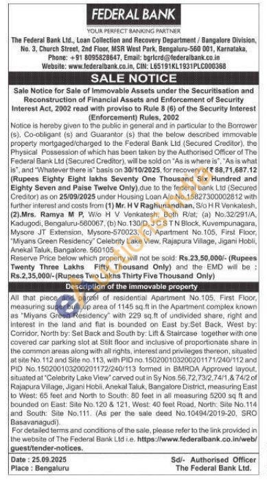 All that piece and parcel of residential Apartment No. 105, First Floor, measuring super built up area of 1145 sq.ft in the Apartment complex known as "Miyans Green Residency with 229 sq.ft of undivided share, right and Interest in the land and flat is bounded on East by:Set Back. West by: Corridor, North by: Set Back and South by: Lift & Staircase together with one covered car parking slot at Stilt floor and inclusive of proportionate share in the common areas along with all rights, interest and privileges thereon, situated at site No. 112 and Site no. 113, with PID no. 150200103200201171/240/112 and PID No. 150200103200201172/240/113 formed in BMRDA Approved layout. situated at "Celebrity Lake View carved out in Sy Nos 56,72,73/2,74/1,874/2 of Rajapura Village, Jigani Hobii, Anekal Taluk, Bangalore District, measuring East to West: 65 feet and North to South: 80 feet in all measuring 5200 sq ft and bounded on East: Site No. 120 & 121, West: 40 feet Road, North: Site No.114 and South: Site No.111. (As per the sale deed No.10494/2019-20, SRO Basavanagudi).