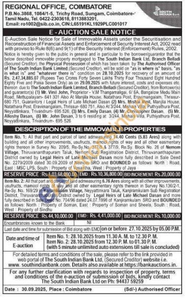 Item No. 2: All that part and parcel of land admeasuring 6.76 Ares along with all other improvements usufructs, mamool rights of way and all other easmentary nights thereon in Survey No.136/2-1. Re-Sy. No. 169/29 in Karumkulam Village, Neyyattinkara Taluk, Kanjiramkulam Sub Registration District. Thiruvananthapuram District owned by Legal Heirs of Late Michael Dasan and more fully described in Sale Deed No. 704/96 dated 24.07.1996 of Kanjiramkulam SRO and BOUNDED as follows North Property of Soman, East Property of Soman and Sheela, South Road. West Property off Sindhu