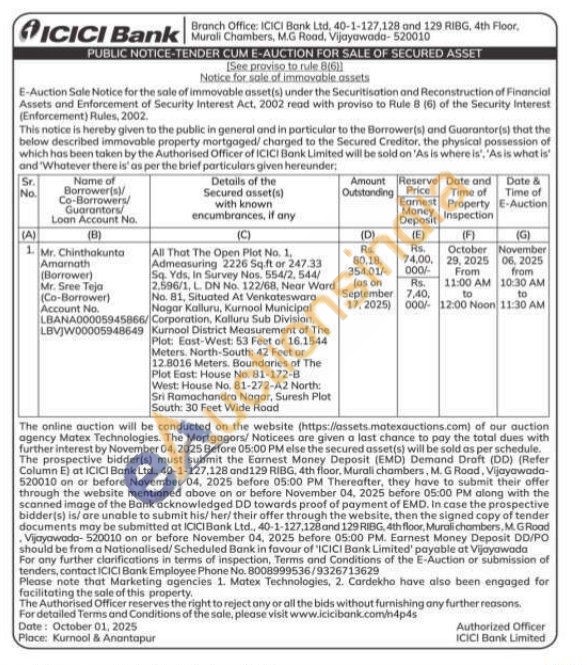 All That The Open Plot No. 1. Admeasuring 2226 Sq.ft or 247.33 Sq. Yds, in Survey Nos. 554/2, 544/2,596/1, L. DN No. 122/68, Near Ward No. 81, Situated At Venkateswara Nogar Kalluru, Kurnool Municipal Corporation, Kalluru Sub Division, Kurnool District Measurement of The Plot: East-West: 53 Feet or 16.1544 Meters. North-South: 42 Feet or 12.8016 Meters. Boundaries of The Plot East: House No. 81-172-8 West: House No. 81-272-A2 North: Sri Ramachandra Nagar, Suresh Plot South: 30 Feet Wide Road