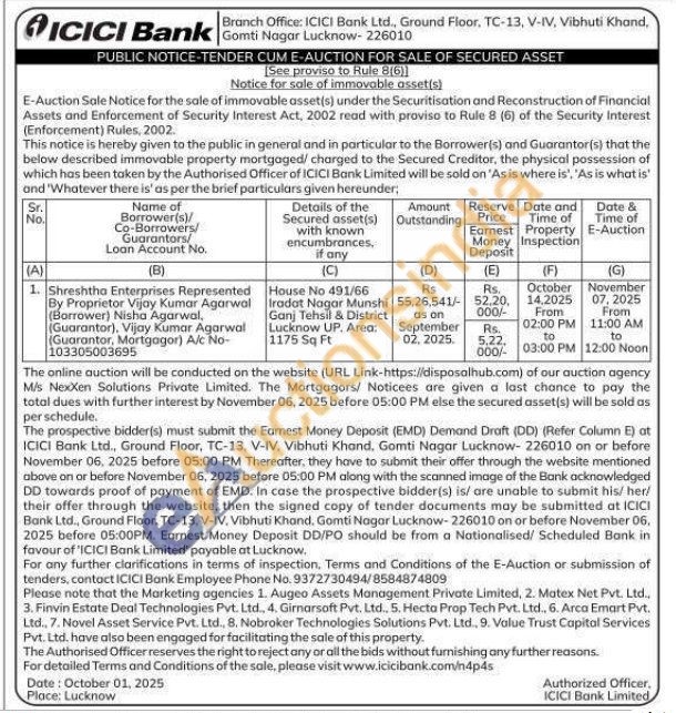 House No 491/66 Iradat Nagar Munshi Ganj Tehsil & District Lucknow UP. Area: 1175 Sq Ft