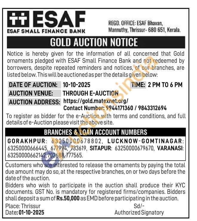 ESAF SMALL FINANCE BANK Gold Auctions Auction in Thrissur