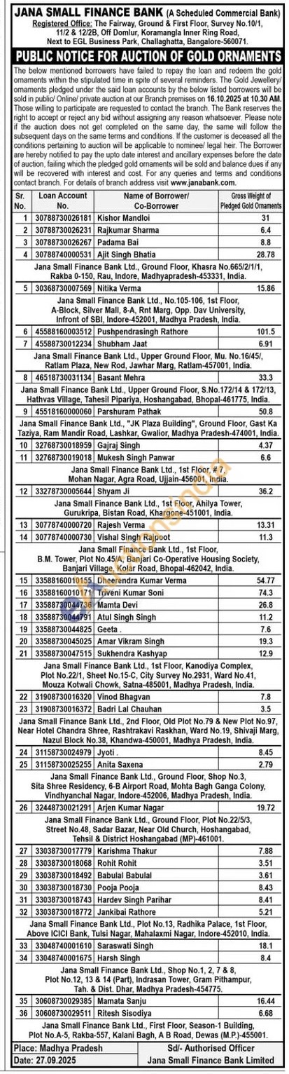 Jana Small Finance Bank Gold Auctions Auction in Bengaluru