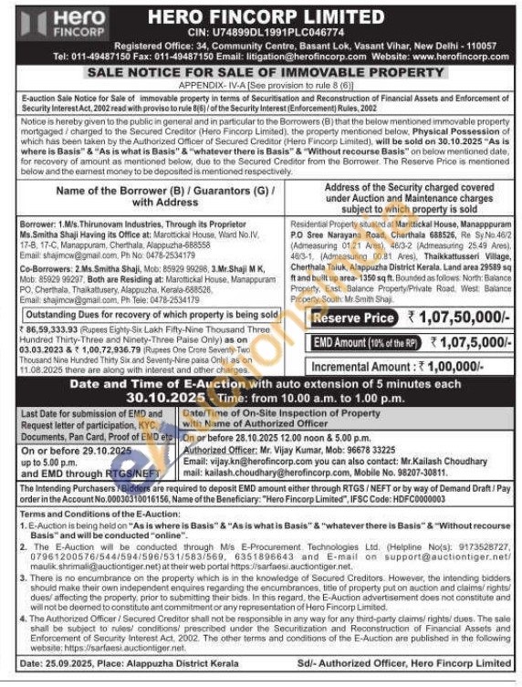 Residential Property situated at Marittickal House, Manapppuram P.O Sree Narayana Road, Cherthala 688526, Re Sy No.46/2 (Admeasuring 01.21 Ares), 46/3-2 (Admeasuring 25.49 Ares), 463-1, (Admeasuring 00.81 Ares), Thaikkattusseri Village, Cherthala Taluk, Alappuzha District Kerala. Land area 29589 sq ft and built up area-1350 sq ft. Bounded as follows North: Balance Property, East Balance Property Private Road West Balance Property, South Mr. Smith Shaj