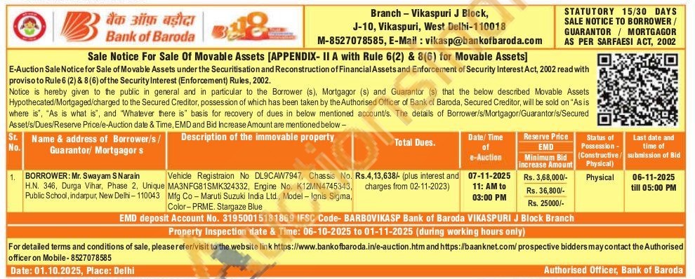 Vehicle Registraion No DL9CAW7947, Chassis No. MA3NFG81SMK324332, Engine No. K12MN4745343, Mfg Co-Maruti Suzuki India Ltd., Model-Ignis Sigma, Color-PRME, Stargaze Blue