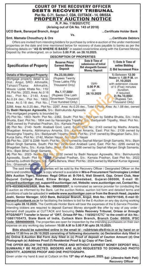 Detalis of Mortgaged Property Mortgage property detail is as Dist.: Angul, SRO: Athmallik, Tahasil/Thana: Athmallik, Mouza: Lipilei, Khata No.: 110/18, Plot No.: 2023, Area: Ac.0 16 dec., Plot No.: 2140, Area: Ac.0.24 dec., Plot No.: 1803, Area: Ac.0.18 dec, Plot No. 2288, Area: Ac.0.25 dec., Plot No.: 2287, Area: Ac. 0.25 dec., Total 5 Plots, Area: Ac. 1.08 dec, owned By Badri Narayan Agrawalla, S/o.: Balmukunda Agrawalla