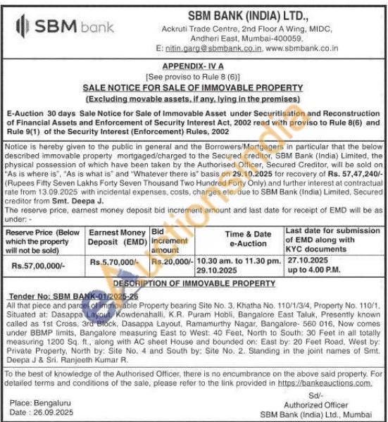 All that piece and parcel of immovable Property bearing Site No. 3. Khatha No. 110/1/3/4, Property No. 110/1. Situated at: Dasappa Layout, Kowdenahalli, K.R. Puram Hobli, Bangalore East Taluk, Presently known called as 1st Cross. 3rd Block, Dasappa Layout, Ramamurthy Nagar, Bangalore- 560 016, Now comes under BBMP limits, Bangalore measuring East to West: 40 Feet, North to South: 30 Feet in all totally measuring 1200 Sq. ft., along with AC sheet House and bounded on: East by: 20 Feet Road, West by: Private Property, North by: Site No. 4 and South by: Site No. 2. Standing in the joint names of Smt. Deepa J & Sri. Ranjeeth Kumar R.
