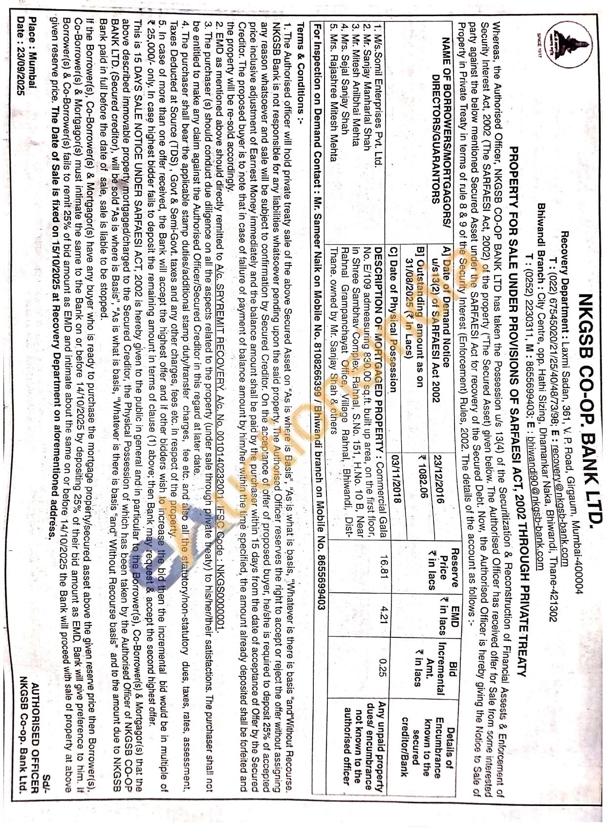 DESCRIPTION OF MORTGAGED PROPERTY: Commercial Gala No. E/109 admeasuring 830.00 sq.ft. built up area, on the first floor, in Shree Sambhav Complex, Rahnal, S.No. 151, H.No. 10 B, Near Rahnal Grampanchayat Office, Village Rahnal, Bhiwandi, Dist-Thane. owned by Mr. Sanjay Shah & others
