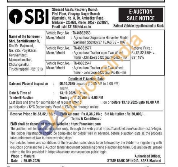 Vehicle Regn.No: TN48BE3553 Make/Model : Agricultural Sugarcane Harvester Model Saktiman SSCH3737 TEJAS BS-IIIA