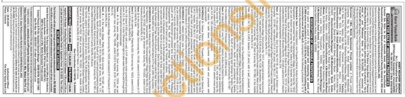 Schedule A: Item: 1-Vellore District, now Tirupattur District, Ambur Sub District for Registration, Vaniyambadi Taluk, Vinnamangalam Village, Govt Survey No. 150/2. as per sub division new survey No. 150/2A, extent 0.39.5 hectare, Kist Rs. 2.52. Boundaries: South of remaining land of Singvi Paper Products private Limited, North and West of Kannadikuppam village limit, East of survey No. 151/1C, in the middle extent 0.19.5 hectare (0.48 acre), Kist Rs. 1.25 with a well and 3 H.P. electric motor pumpset and pumpshed, service connection No. 216.