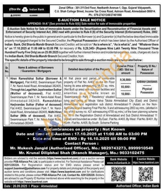 All that piece and parcel of immovable property of Flat No A/402 on the 4th Floor having its area admeasuring 58.52 sq. mirs (Net Built up area) with common facilities and amenities in a scheme known as Swaminarayan Park 7 Residency situated lying and being at Mouje Vatva Taluka Ahmedabad City (East) and District Ahmedabad and registration sub district Ahmedabad-11 (Aslali) on the Non-- Agricultural land bearing Final Plot No. 9 and admeasuring 2853 sq.mtrs. (allotted in lieu of the survey no. 421 admeasuring 4755 sq.mtrs.) of the town planning scheme , no. 80 in the Registration District of Ahmedabad and Sub District Ahmedabad 11 (Aslali) and bounded as under: By East. Flat No. A/403, By West: Flat No. B/401. By North: Flat No. A/405, By South: Scheme Parking
