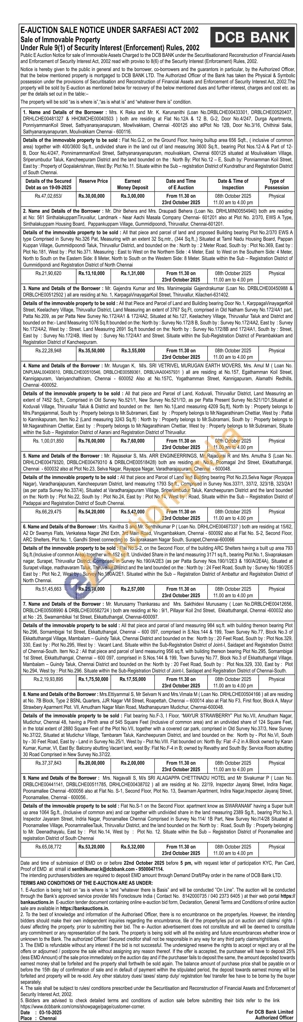 Details of the immovable property to be sold: All that piece and Parcel of Land and Building bearing Plot No.23, Selva Nagar (Royappa Nagar), Varadharajapuram, Kancheepuram District, land measuring 1793 Sq.ft., Comprised in Survey Nos.337/1, 337/2, 323/1B, 323/2A1 (as per patta Survey No.337/4), Situated at Varadharajapuram Village, Sriperumbudur Taluk, Kancheepuram District and the land bounded on the: North by: Plot No.22, South by: Plot No.24, East by: Plot No.14, West by: Road, Situate within the Sub-Registration District of Padappai and Registration District of South Chennai